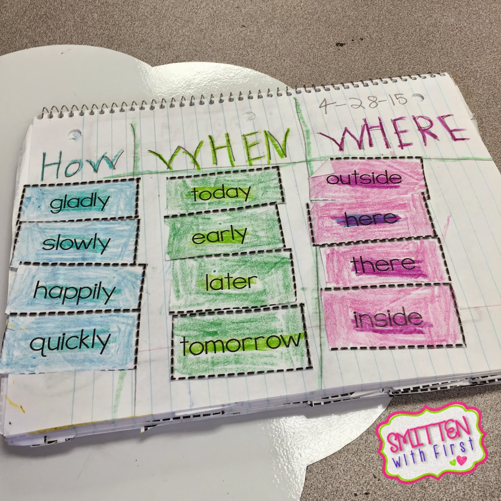 Once we had down what an adverb is, we then started looking at the different types of adverbs -how, when, and where. Each kiddo got a sticky note with an adverb on it. We sorted them onto the correct category.