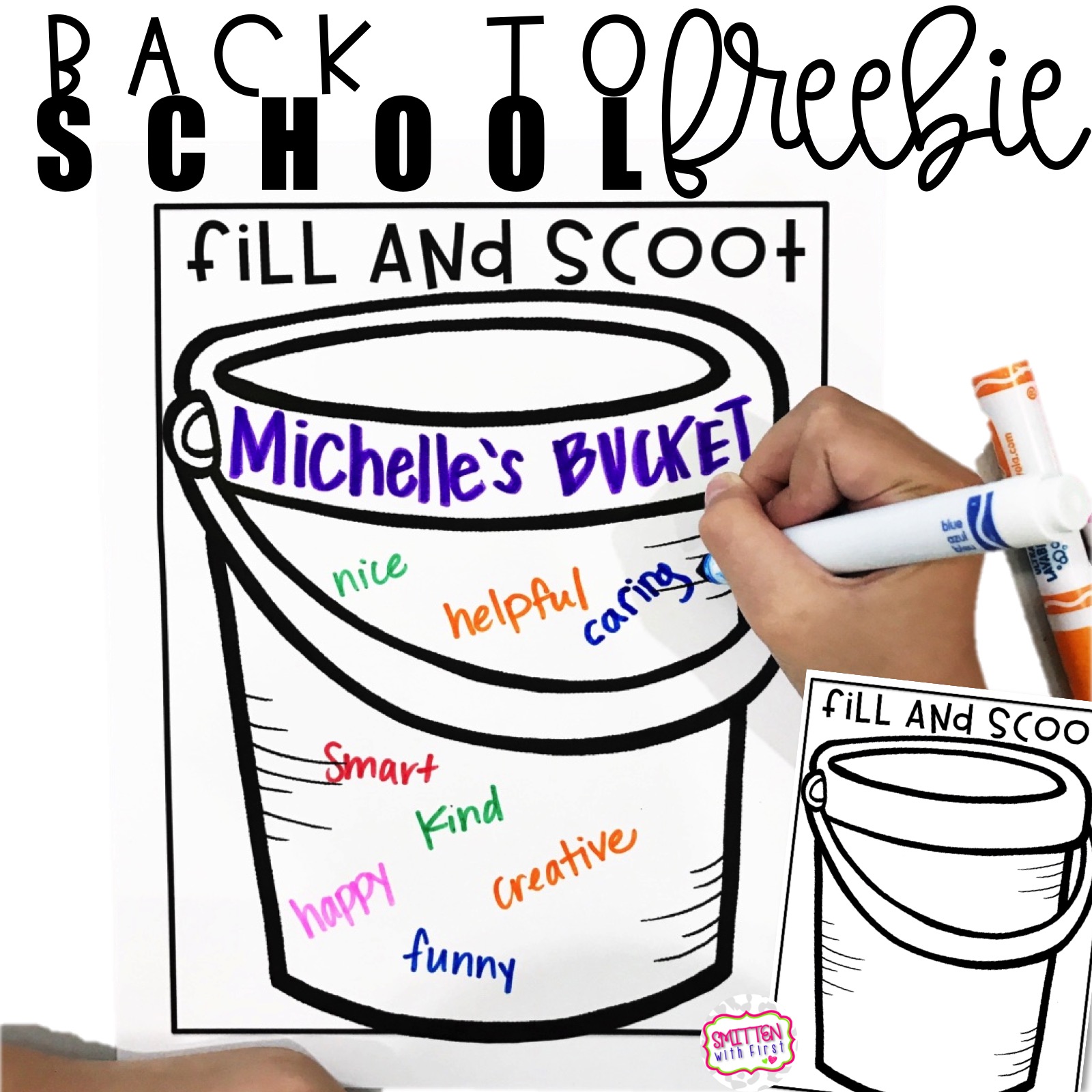 Students can also play Fill and Scoot by writing a kind word about their friend inside their friend’s bucket. Students will each have a bucket page sitting on their table with their name on it. Students will write a kind word and SCOOT to the next student’s bucket when the teacher calls “Scoot”. This continues until all students have been to everyone’s bucket. You can download this freebie here.
