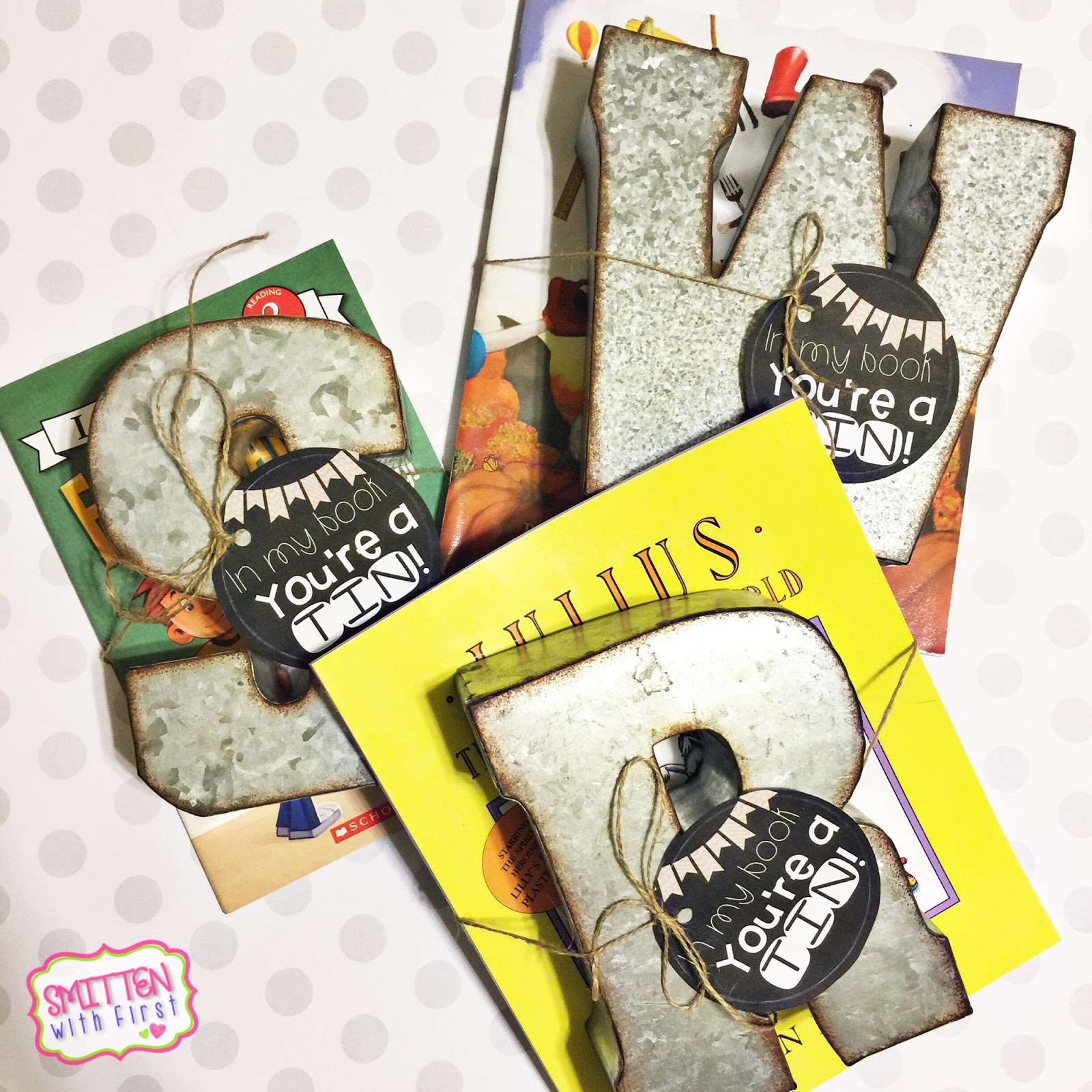 Next, I grabbed a few Scholastic books I had left over from previous book orders, some burlap twine, and these tags for a quick, cheap, simple and cute teacher gift.